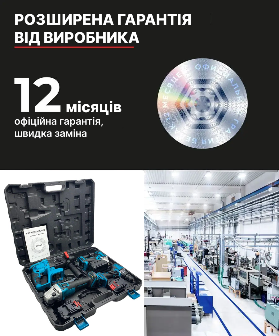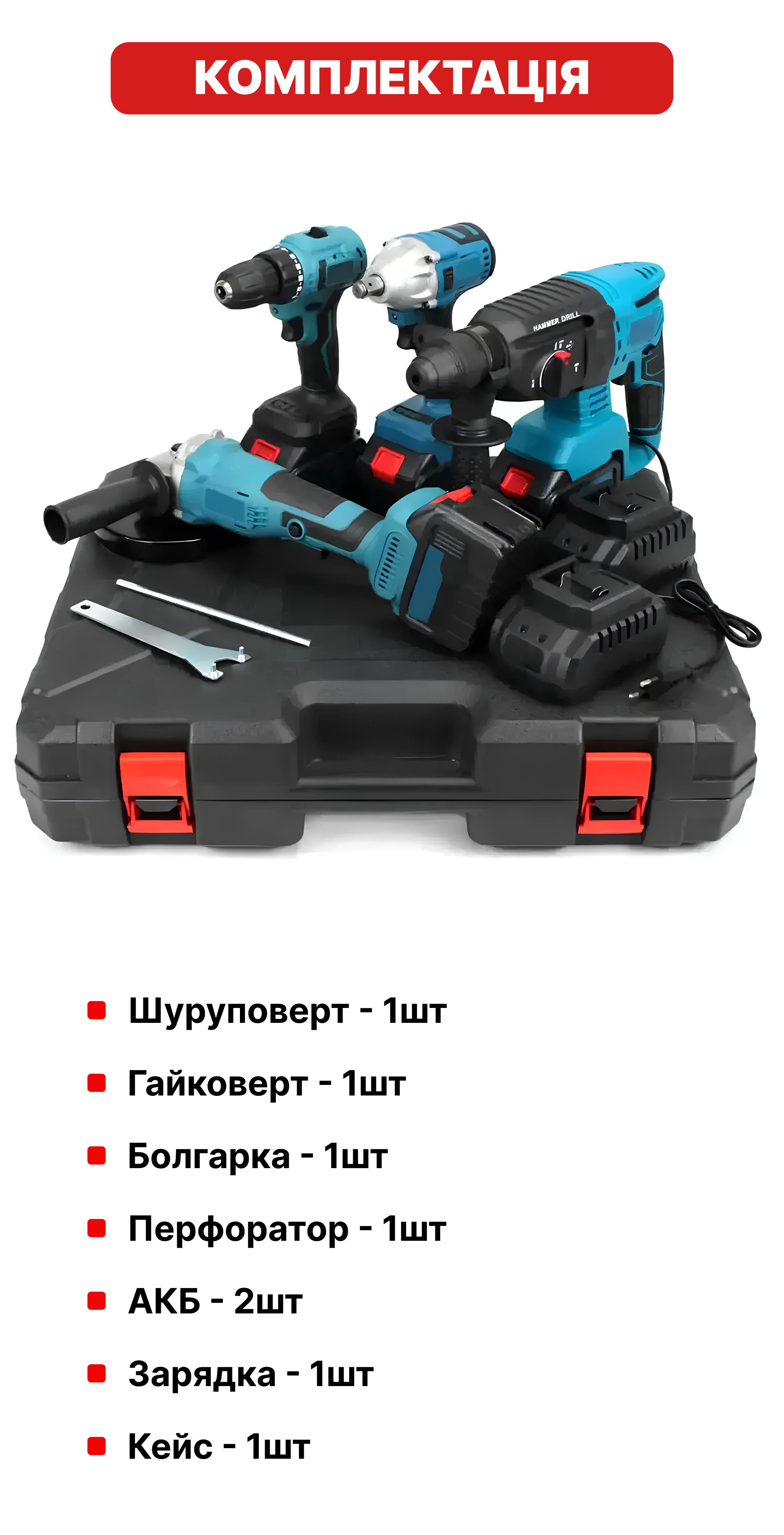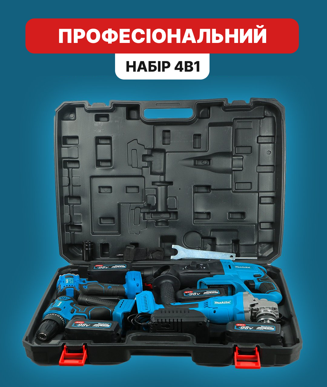 Це універсальне рішення для будь-яких завдань вдома, в майстерні чи на дачі. У комплекті все найнеобхідніше: перфоратор, болгарка, шуруповерт та гайковерт — зручний набір, який економить місце, час і кошти. Ідеально підходить для ремонту, будівництва та щоденних побутових робіт.